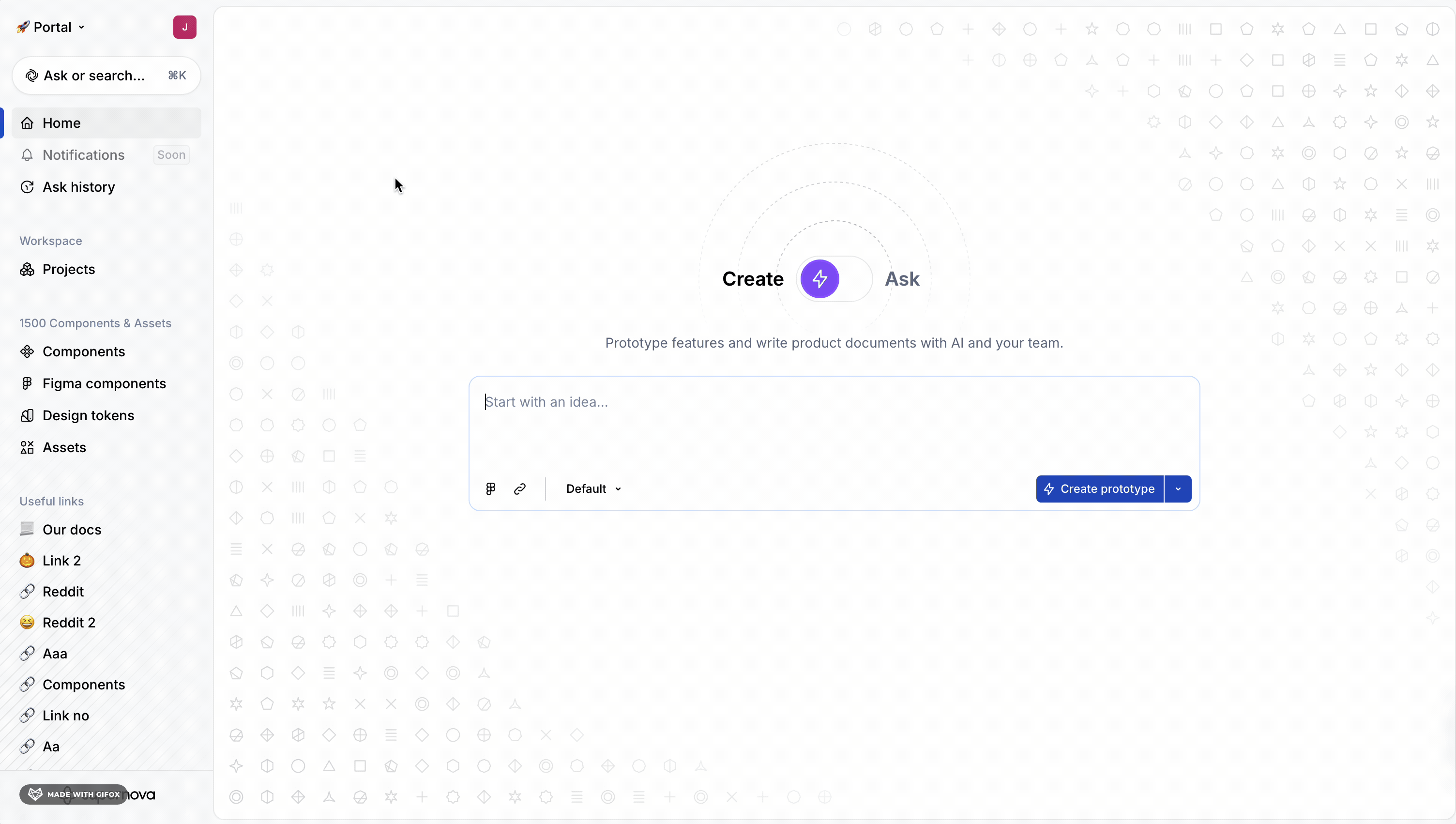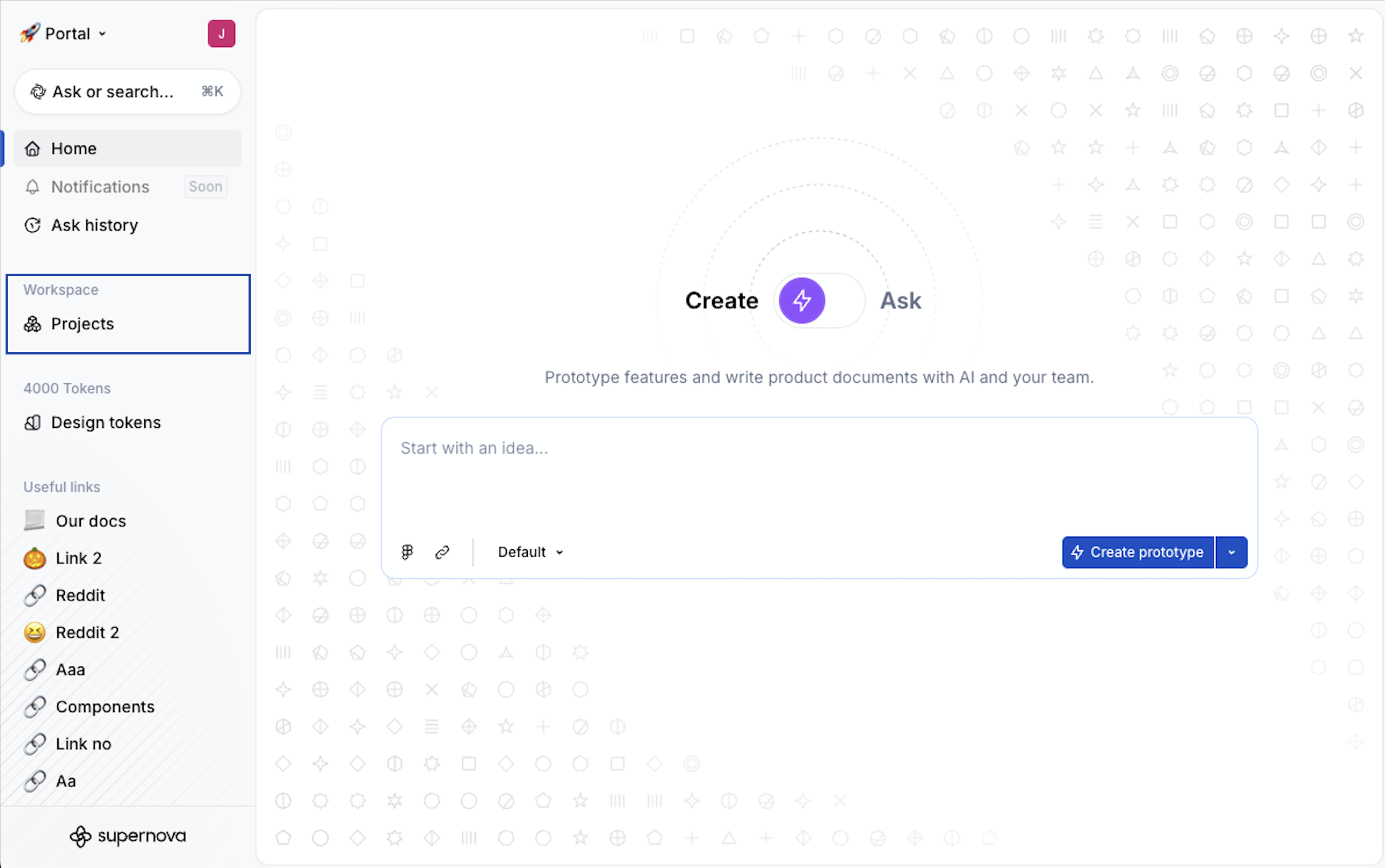 Click in the Create prompt window and describe what project you want to work on. You can create either a prototype or a document. When you send a prompt, the project is automatically created.