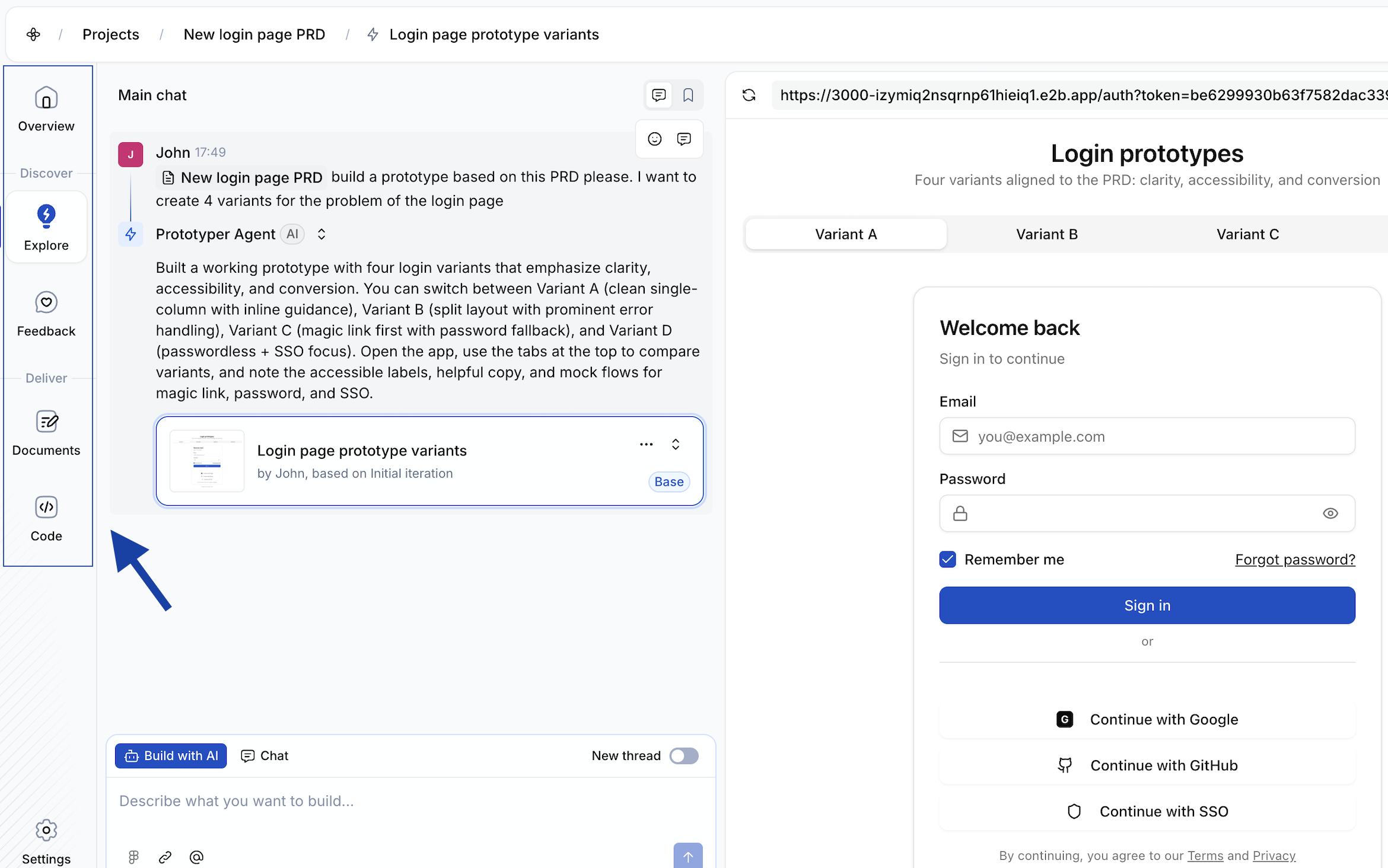 - Write product documents — from PRDs to release notes — alongside your prototypes.